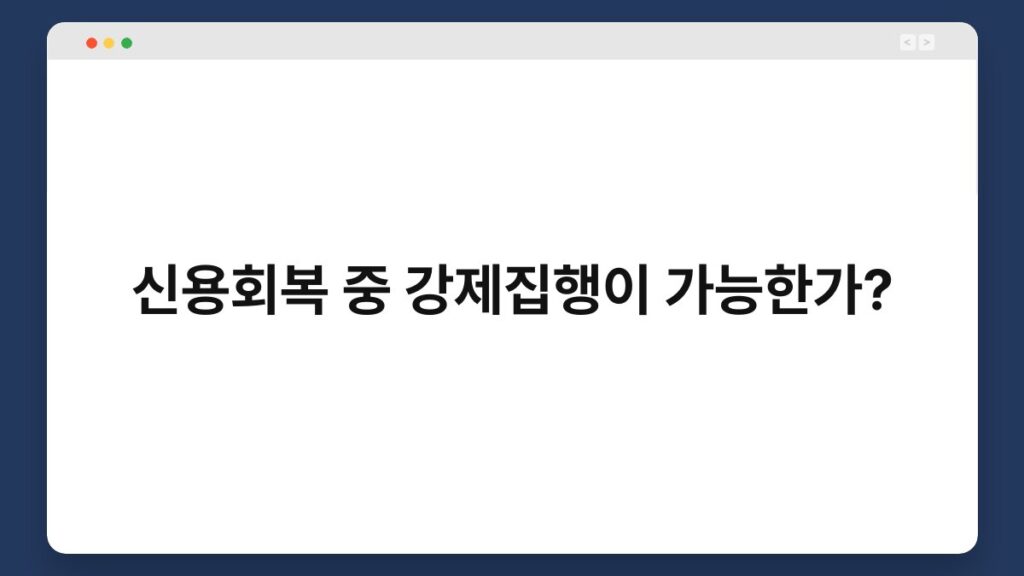 신용회복 중 강제집행이 가능한지에 대한 질문은 많은 분들이 궁금해하는 주제입니다. 특히 채무 문제로 어려움을 겪고 있는 분들이라면 더욱 그렇겠죠. 신용회복을 ...